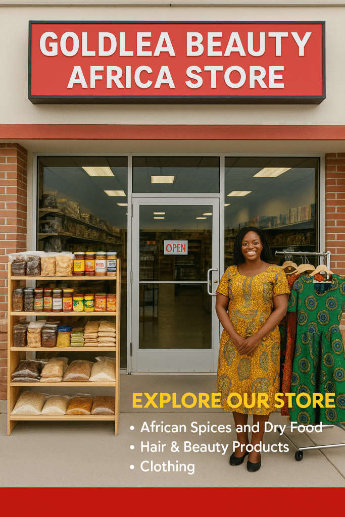 Goldlea Beauty Africa Store brings you the vibrant taste and beauty of Africa under one roof. We specialize in authentic African spices, dry foods, and all varieties of traditional ingredients that make your meals feel like home. Beyond food, we offer premium African hair products, stylish clothing, and essentials that celebrate our rich heritage. At Goldlea, we pride ourselves on delivering quality products with excellent service. Whether you’re cooking your favorite dish, styling your hair, or dressing in cultural fashion, we are here to serve you with heart and heritage.